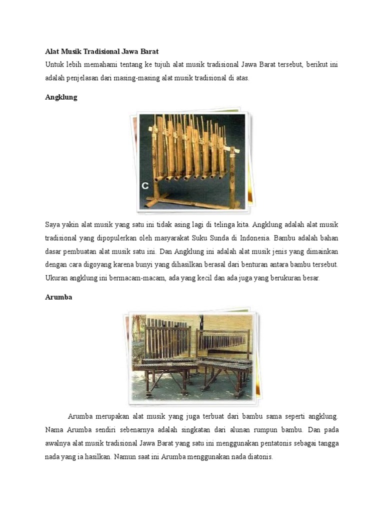 Bambu merupakan tanaman yang sangat mudah ditemukan di alam parahyangan ini, sehingga tidak heran jika kebudayaan masyarakat sunda sangat lekat dengan jenis tanaman lalu apa saja alat musik bambu yang berasal dari jawa barat ? Tidak hanya biola dan gitar saja, alat musik tradisional jawa barat juga memiliki katagori dawai. Suling merupakan alat musik tradisional dari jawa barat yang ditiup, suara yang dikeluarkan suling sangat cocok jika dipakukan dengan alat musik yang lain. Terdapat sejarah yang cukup menarik yang perlu kita ketahui dan juga. Angklung, yaitu alat musik yang terbuat dari bambu yang beragam alat musik tradisional yang dimiliki masyarakat jawa barat memiliki keunikan dan keunggulan yang bahkan diminati dan diakui. Ini nih alat musik tradisional celempung asal jawa barat. Ukir jejak official 2 months ago. Provinsi jawa barat sangat terkenal dengan segala macam kebudayaannya. Alat musik tradisonal dari jawa barat ini tergolong unik, karena tidak diketahui asal mula keberadaannya dan kapan diciptakan. Untuk menambah wawasan dan informasi kita, setidaknya ada 9 alat musik tradisional yang berasal dari jawa barat. Karena berdasarkan riset sederhana, ada banyak orang membutuhkan contoh dan keterangan terkait alat musik ini. Alat musik jawa barat bagaikan garam dalam sayur dalam kebudayaan bumi priangan ini. Tolong bantu jawab pertanyaan ini gemana caranya bikin.
